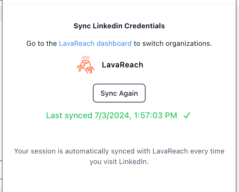After signing in, the extension popup should saw "Head to LinkedIn to sync your session cookie with LavaReach".
